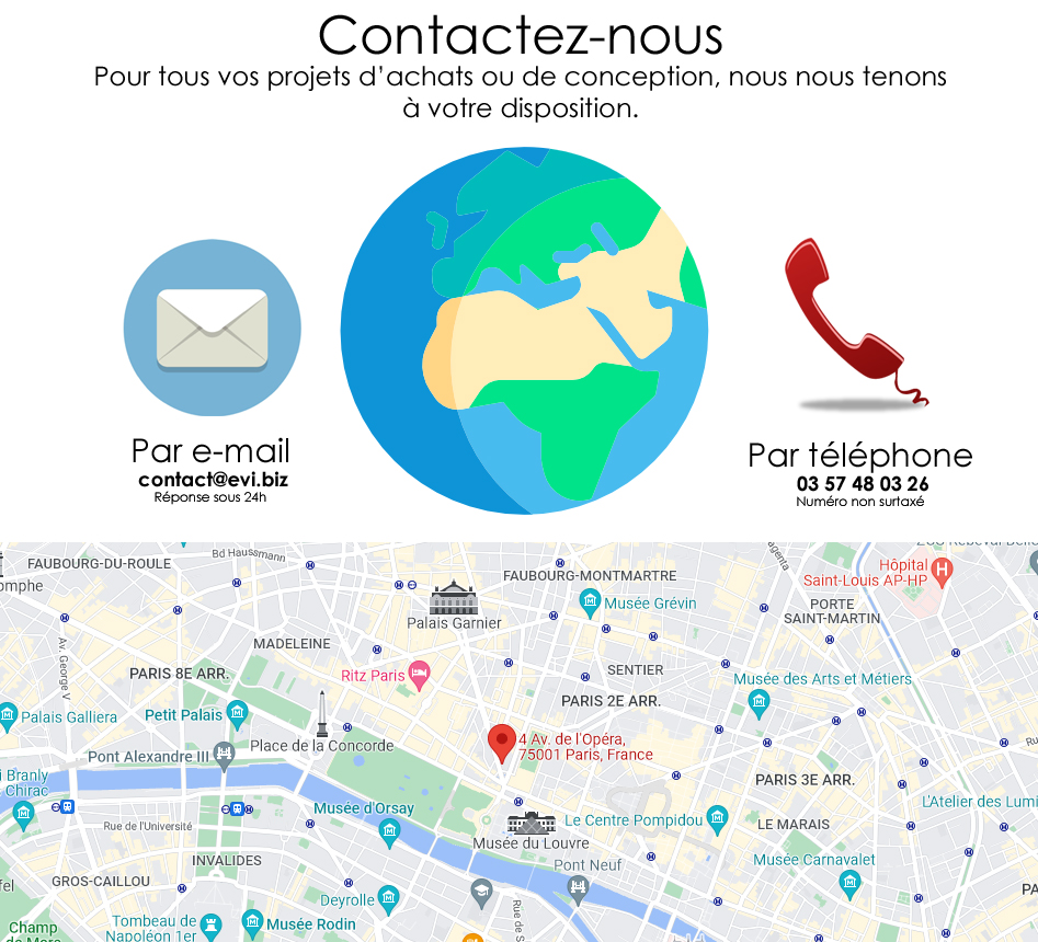 Pour tous vos projets d'achat ou de conception sur-mesure, contactez-nous au 03-57-48-03-26 ou par e-mail. EVI est un concepteur et fabricant de tablettes et PC personnalisés en marque blanche. Contactez-nous également pour devenir revendeur. Nous sommes situés à Paris, en France.