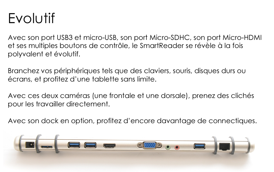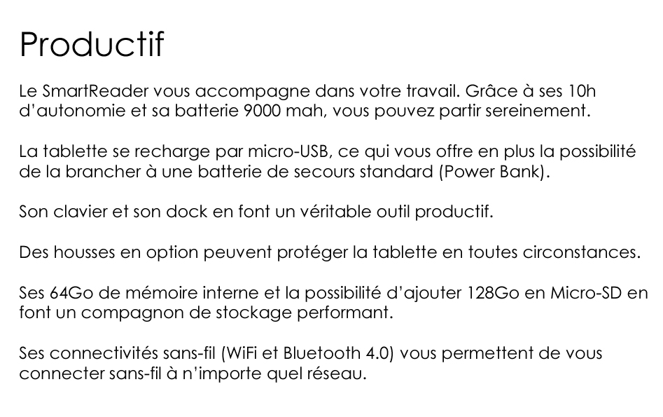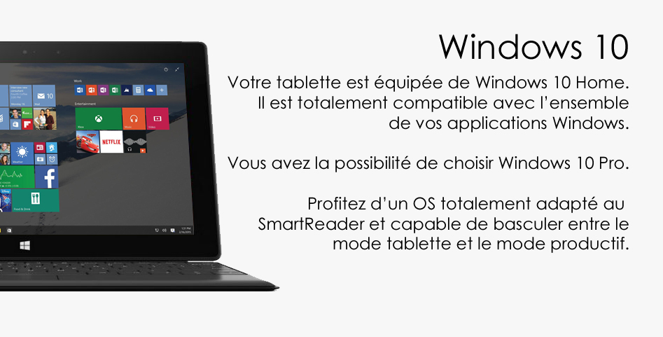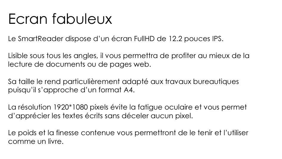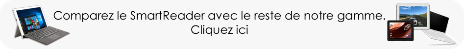 Découvrez SmartReader. Une tablette 12.2 pouces ultra-fine, ultra-légère et ultra-autonome. #FrenchTech . Processeur Intel Quad-Core, 4Go de RAM et 64Go de mémoire. Ecran 12.2 pouces IPS Full HD. Jusqu’à 10 heures d’autonomie. Port USB 3.0, deux caméras, avec écran capacitif. Garantie 2 ans, avec pick-up en cas de panne. Compatible Windows et Android. Assemblé en France. A partir de 399€ TTC. Qualitatif. Découvrez une tablette design équipée de composants de qualité. L’aluminium, la finesse extrême, la solidité accrue et le clavier en velours en font une tablette agréable au toucher et à l’utilisation. L’intégration de composants Intel, d’un écran de haute qualité et le soin apporté aux finitions valorise l’utilisation. La garantie 2 ans, le support téléphonique et par email et le rapatriement sans frais en cas de problème rassure sur la qualité du SmartReader. Ecran fabuleux. Le SmartReader dispose d’un écran FullHD de 12.2 pouces IPS. Lisible sous tous les angles, il vous permettra de profiter au mieux de la lecture de documents ou de pages web. Sa taille le rend particulièrement adapté aux travaux bureautiques puisqu’il s’approche d’un format A4. La résolution 1920*1080 pixels évite la fatigue oculaire et vous permet d’apprécier les textes écrits sans déceler aucun pixel. Le poids et la finesse contenue vous permettront de le tenir et l’utiliser comme un livre. Productif. Le SmartReader vous accompagne dans votre travail. Grâce à ses 10 heures d’autonomie et sa batterie 9000 mah, vous pouvez partir sereinement. La tablette se recharge par micro-USB, ce qui vous offre en plus la possibilité de la brancher à une batterie de secours (Power Bank) standard. Son clavier et son dock en font un véritable outil productif. Des housses en option peuvent protéger la tablette en toutes circonstances. Ses 64Go de mémoire interne et la possibilité d’ajouter 128Go en Micro-SD en font un compagnon de stockage performant. Ses connectivités sans-fil (WiFi et Bluetooth 4.0) vous permettent de vous connecter sans-fil à n’importe quel réseau. Evolutif. Avec son port USB3 et micro-USB, son port Micro-SDHC, son port Micro-HDMI et ses multiples boutons de contrôle, le SmartReader se révèle à la fois polyvalent et évolutif. Branchez vos périphériques tels que des claviers, souris, disques durs ou écrans, et profitez d’une tablette sans limite. Avec ces deux caméras (une frontale et une dorsale), prenez des clichés pour les travailler directement. Avec son dock en option, profitez d’encore davantage de connectiques. Ergonomique. Léger et ergonomique, le SmartReader vous offre plusieurs modes de lecture. En mode tablette, portrait ou paysage, utilisez le SmartReader assis ou couché et profitez d’un écran tactile et d’un mode “Tablette” adapté de Windows. En mode laptop, tel un ordinateur portable, utilisez le SmartReader sur un bureau grâce à sa charnière arrière, entièrement en aluminium, proposant deux orientations de l’écran, selon que vous souhaitiez travailler ou visionner une vidéo. Cette charnière permet aussi de poser la tablette sur une table en mode paysage et ainsi profiter d’un mode adapté à la présentation d’un document A4 ou à la lecture d’un e-magazine ou e-book. Android. En exclusivité sur nos tablettes, nous vous proposons d’installer Android 5.1, en Dual-Boot avec Windows. Ce système vous permettra de profiter encore plus de votre tablette pour organiser vos documents, photos, et vidéos ou pour jouer à vos jeux favoris. Découvrez aussi son Google Play Store et télécharger de nombreux jeux et applications compatibles. Windows 10. Votre tablette est équipée de Windows 10 Home. Il est totalement compatible avec l’ensemble de vos applications Windows. Vous avez la possibilité de choisir Windows 10 Pro. Profitez d’un OS totalement adapté au SmartReader et capable de basculer entre le mode tablette et le mode productif. SmartReader. A partir de 399€. Garantie 2 ans avec pick-up en cas de panne. Contactez-nous.