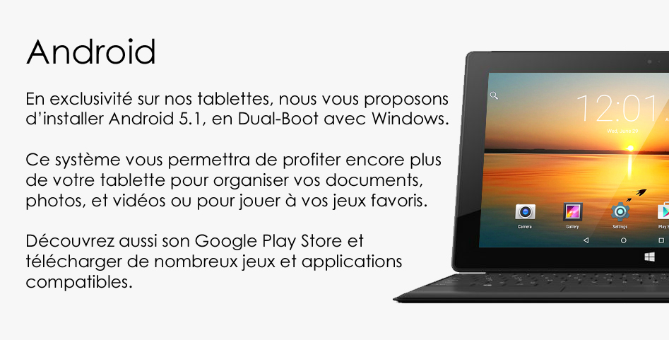 Système d'exploitation : Windows 10 Home intégré. Windows 10 Pro et Dual-Boot Win 10 / Android 5.1 en option.
