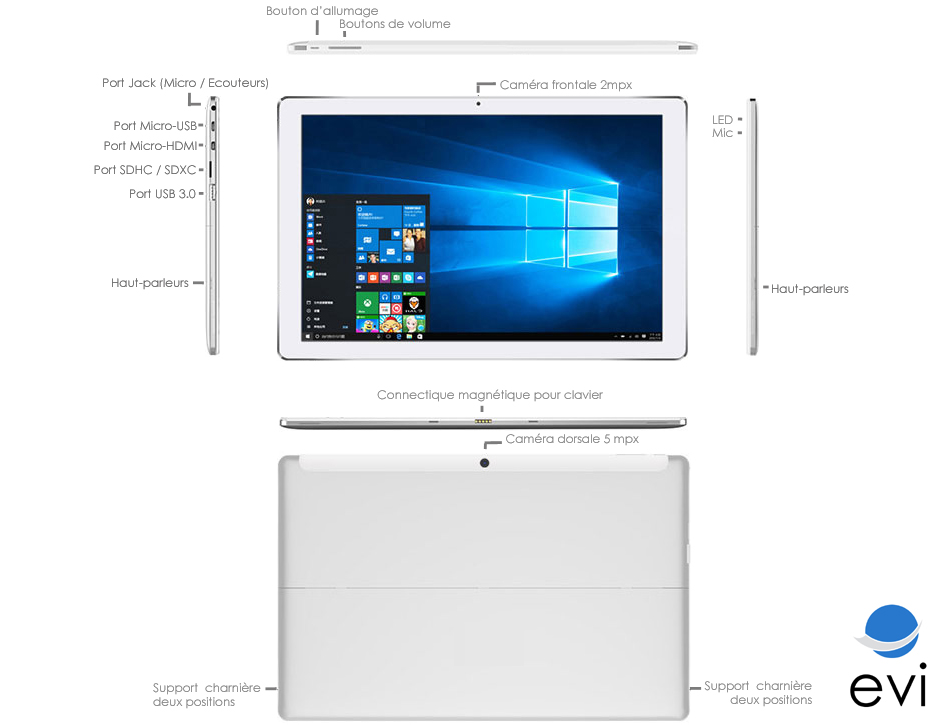 Dispositif d'entrée : Tactile (multitouch 10 points). En option, stylet capacitif ou Touchpad + 2 boutons (clic droit et gauche) sur clavier AZERTY.