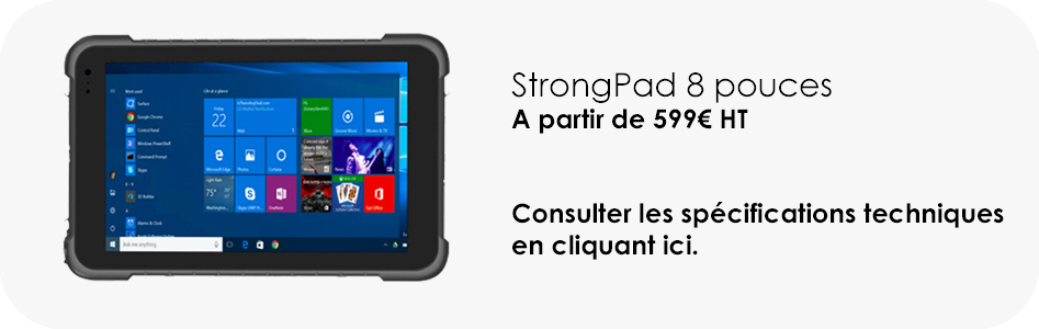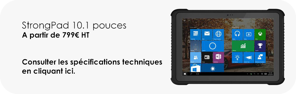 Découvrez StrongPad. La tablette renforcée d'EVI. Disponible en marque blanche Certifications IP65 et IP67. Dustproof. Waterproof. Shockproof. Disponible en 8 pouces, 10.1 pouces ou 12.2 pouces. Lecteurs de code-barres 1D et 2D. NFC et MiFare. 3G UMTS, 4G LTE et GPS. Connectique Ports Série et USB. Ecran IPS lisible en plein soleil. Batterie amovible sur les modèles 10 et 12 pouces. Recharge indépendante sur station d'accueil. Jusqu’à 10 heures d’autonomie. Utilisation au doigt ou au stylet digitizer. Lecteur d’empreintes digitales. Disponible avec Windows 10 ou Android. A partir de 599€ HT. #FrenchTech