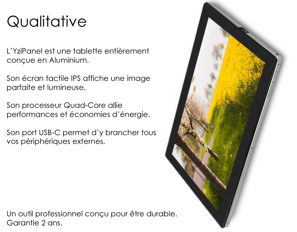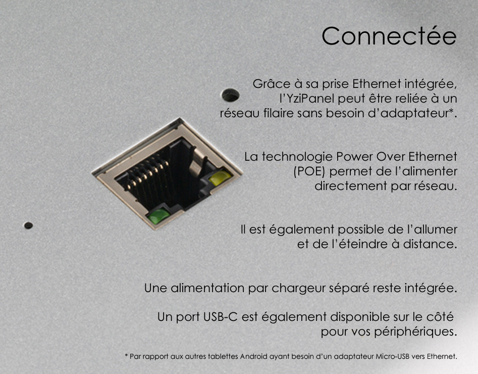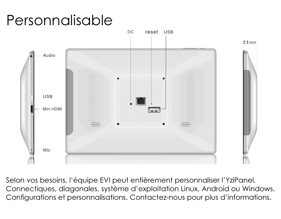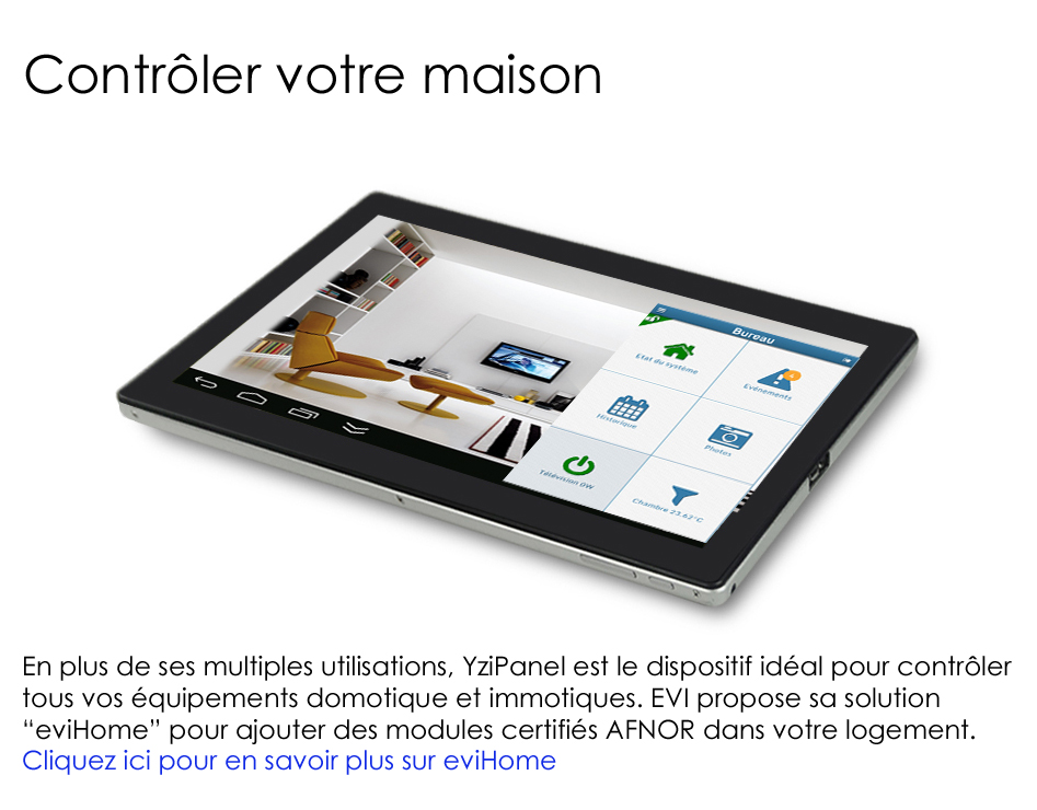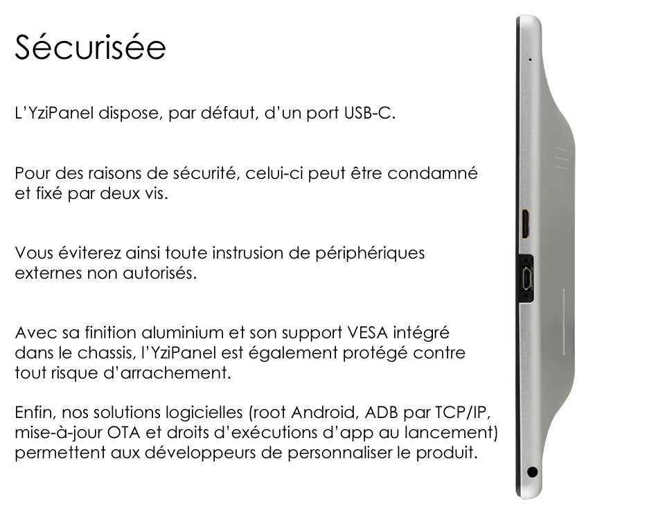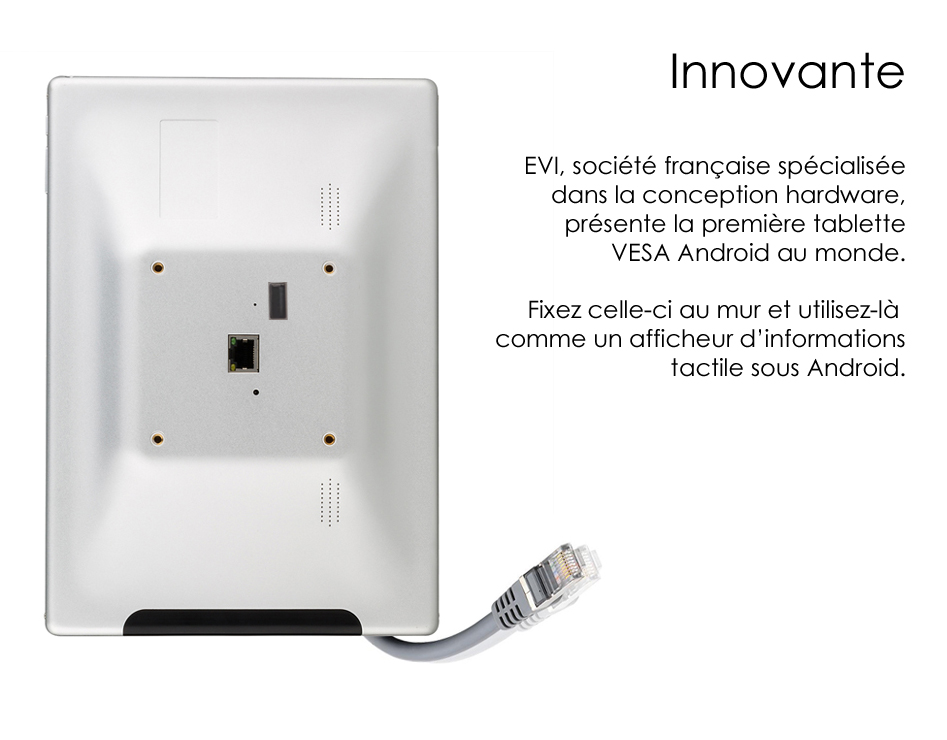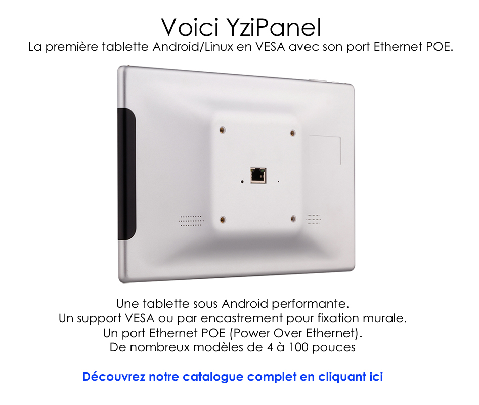 YziPanel. La première tablette VESA sous Android, avec port Ethernet POE (Power Over Ethernet, norme IEEE802.3at) conçue et assemblée en France. Une tablette de 4 à 100 pouces sous Android performante. Un support VESA pour fixation murale ou encastrable. Une tablette qui peut servir de portier, de télécommande, de contrôle domotique, ou de judas numérique. Un port Ethernet POE (Power Over Ethernet). Une tablette murale avec ou sans batterie. Entièrement aluminium et totalement unique. A partir de 399€ TTC. Innovante. EVI, société française spécialisée dans la conception hardware, présente la première tablette VESA (75mm * 75mm) Android au monde. Fixez celle-ci au mur et utilisez-là comme un afficheur d’informations tactile sous Android. Qualitative. L’YziPanel est une tablette entièrement conçue en Aluminium. Son écran tactile IPS affiche une image parfaite. Son processeur Quad-Core Rockchip allie performances et économies d’énergie. Un outil professionnel conçu pour être durable. Garantie 3 ans. Connectée. Grâce à sa prise Ethernet intégrée, l’YziPanel peut être reliée à un réseau filaire sans besoin d’adaptateur. La technologie Power Over Ethernet (POE) permet de l’alimenter directement par réseau. Il est également possible de l’allumer et de l’éteindre à distance. Une alimentation par chargeur séparé reste intégrée. Sécurisée. L’YziPanel dispose, par défaut, d’un port USB Type C. Pour des raisons de sécurité, celui-ci peut être condamné et fixé par deux vis. Vous éviterez ainsi toute instrusion de périphériques externes non autorisés. Avec sa finition aluminium et son support VESA intégré dans le chassis, l’YziPanel est également protégé contre tout risque d’arrachement. Enfin, nos solutions logicielles (root Android, ADB par TCP/IP, mise-à-jour OTA et droits d’exécutions d’app au lancement) permettent aux développeurs de personnaliser le produit. Personnalisable. Selon vos besoins, l‘équipe EVI peut entièrement personnaliser l’YziPanel. Connectiques, configurations, personnalisations, contactez-nous pour plus d’informations. La gamme YziPanel de 4 à 100 pouces est disponible dans notre catalogue. Découvrez nos autres modèles de tablettes POE (avec ou sans batterie) françaises sous Android, Windows ou Linux. Catalogue YziPanel : tablettes murales et solutions d’affichage professionnel conçu in France. Le catalogue YziPanel présente l’ensemble de la gamme de tablettes murales EVI, conçues pour les environnements professionnels tels que le bâtiment connecté, la domotique, l’hôtellerie, la santé, le retail ou l’industrie. Ces tablettes Android ou Windows se distinguent par leur conception soignée, leur fiabilité et leur compatibilité avec les systèmes d’automatisation et de contrôle les plus courants. Développées pour un usage intensif 24h/24 et 7j/7, elles sont disponibles en plusieurs formats, de 5 à 14 pouces, avec écran tactile capacitif, alimentation PoE ou 12 V, et montage mural ou encastré. Les modèles YziPanel offrent une intégration simple et esthétique grâce à un design épuré et des matériaux robustes. Chaque produit est personnalisable selon les besoins des intégrateurs : logo, firmware, connectique ou finitions. Le catalogue détaille également les options d’accessoires et de fixation ainsi que les versions spécifiques pour salles de réunion, contrôle d’accès, bornes interactives et gestion énergétique. Conçues et assemblées en France par EVI SAS, les tablettes YziPanel bénéficient d’un support technique dédié et d’une garantie 3 ans avec échange à neuf. Téléchargez le catalogue YziPanel pour découvrir l’ensemble des caractéristiques techniques, options de personnalisation et exemples d’intégration dans des projets professionnels en Europe et à l’international. The YziPanel catalog showcases the complete range of EVI wall-mounted tablets, designed for professional environments such as smart buildings, home automation, hospitality, healthcare, retail, and industry. Click here to view it. #TablettePOE #POE #FrenchTech