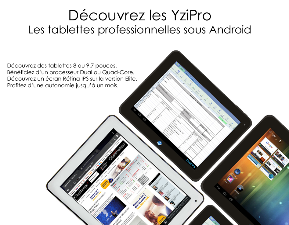 Voici les YziPro. Les tablettes professionnelles. Processeurs Quad-Core. Disponibles en version 8 et 9.7 pouces. Jusqu'à 2Go de RAM et un mois d'autonomie en veille (sur la version Elite). Toutes sont livrées avec notre suite bureautique.
